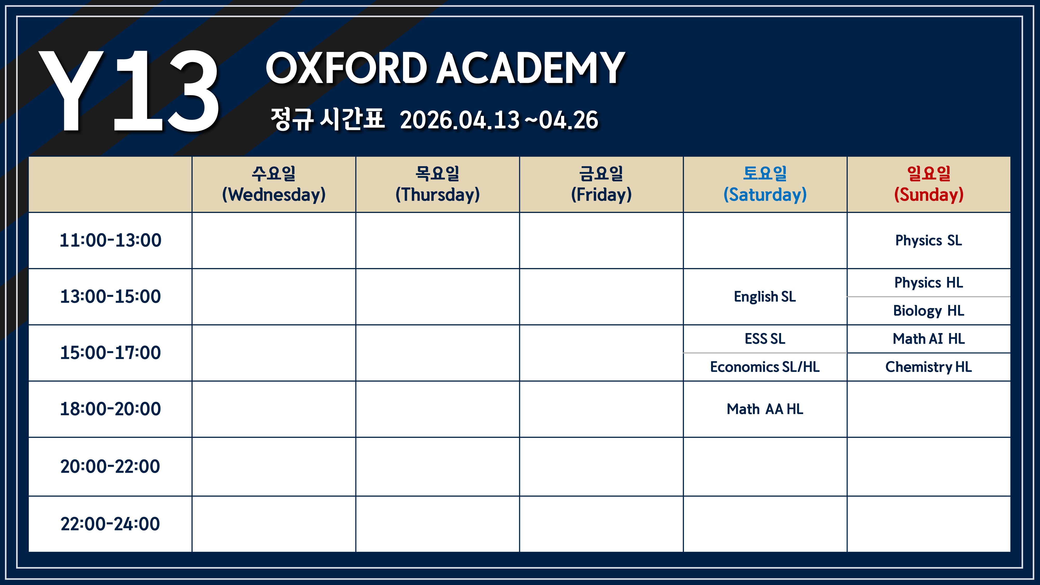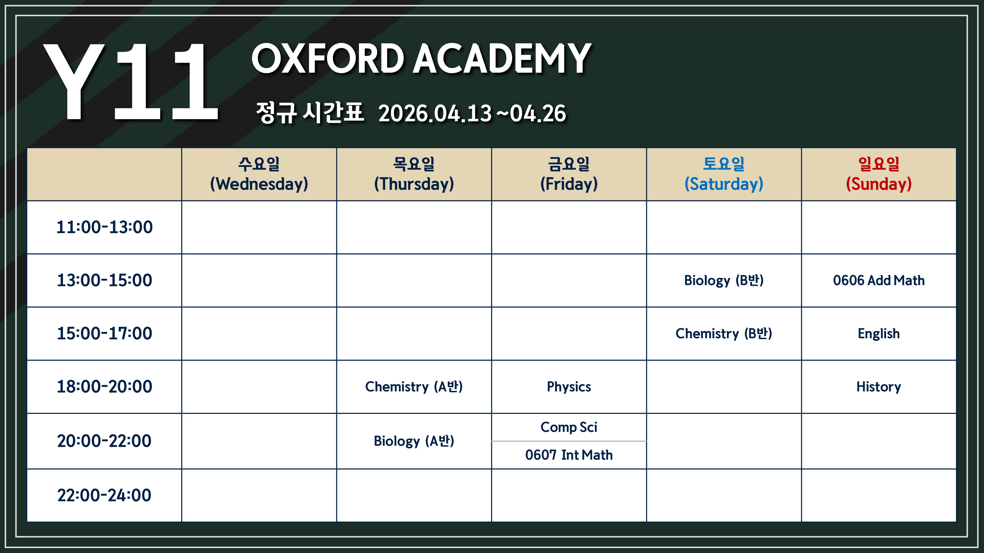 2026년 Y11, Y13 Spring 정규반 (제주) 스케줄 입니다 :)